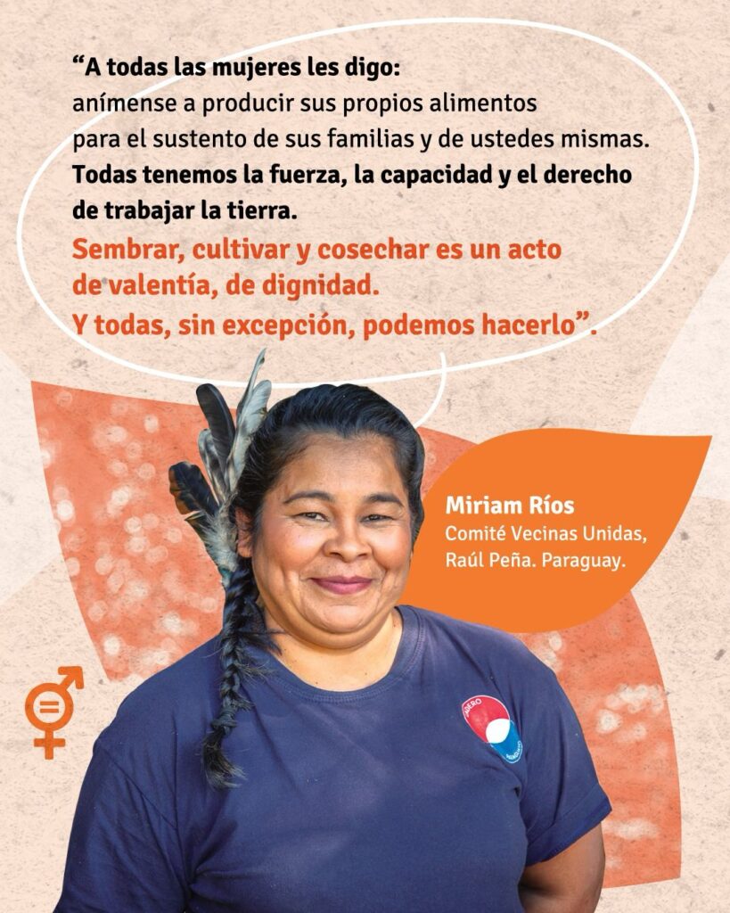 Las desigualdades se reflejan en el acceso a la tierra, los recursos productivos y la participación en las decisiones. “Encontrarme con otras mujeres marcó un antes y un despuésen mi vida. Aprendí a cuidar mi huerta, pero también a conocer mis derechos. Entendí que mi voz vale. Si no soltamos la mano de la otra, vamos a seguir avanzando. Juntas somos más fuertes”, dice Ada Primitiva Peralta del Comité Tembiaporá Rekavom en Paraguay.