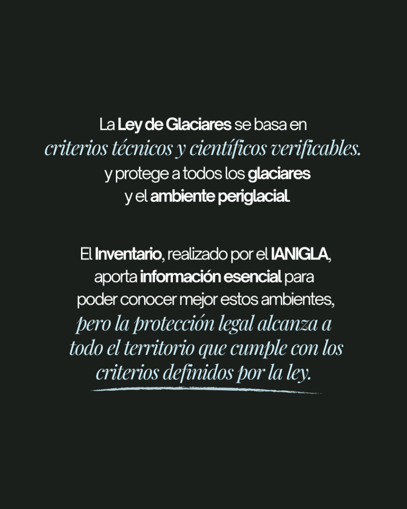 En su documento, las organizaciones destacan también el rol del Instituto Argentino de Nivología, Glaciología y Ciencias Ambientales (IANIGLA) en la implementación de la Ley y en la conservación de los glaciares. Subrayan, además, la necesidad de reforzar sus competencias y presupuesto para cumplir y profundizar las tareas asignadas por la norma.