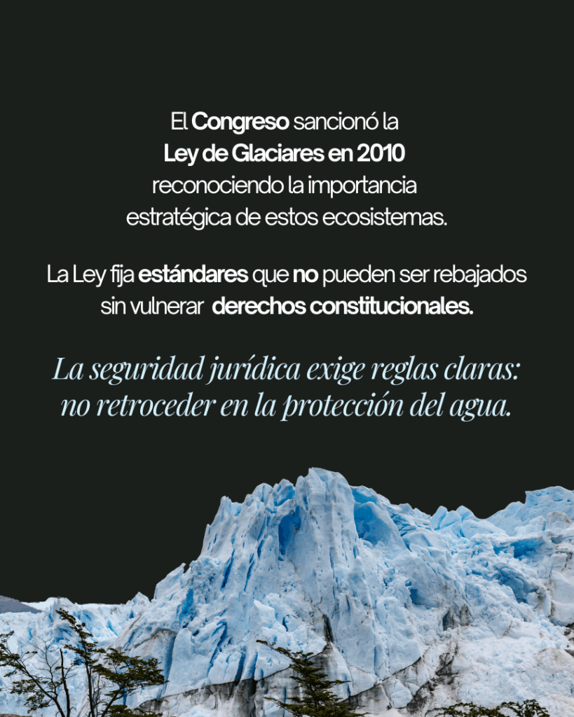 La Ley de Glaciares, sancionada en 2010, constituye un hito en materia de desarrollo sostenible en la Argentina. Fue resultado de un amplio debate social, parlamentario y jurídico, y su propósito es proteger reservas estratégicas de agua dulce que hacen posible la vida y el desarrollo en gran parte del territorio, en particular en las zonas áridas, en las que la provisión de agua es crítica. Modificarla implicaría habilitar, en un ecosistema vulnerable, actividades económicas —especialmente la minería de gran escala— con alto impacto ambiental y, entre otras cosas, la pérdida del agua almacenada en ellos.